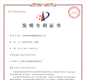 湖北元大糧油科技有限公司,始創(chuàng)于2007年,注冊資金1500萬元,占地150余畝,主要從事油脂原料種植、產(chǎn)品研發(fā)、原料加工(500噸/日)、精煉,分提(共400噸/日)、分裝(700噸/日)、油脂倉儲(15萬噸,已建成5萬噸)、品牌運(yùn)營、包裝材料(紙箱與油壺)、油脂國內(nèi)貿(mào)易等相關(guān)產(chǎn)業(yè)鏈板塊。根據(jù)時代的發(fā)展、市場的需求,在國內(nèi)外專家及大專院校的幫助下,經(jīng)過十多年的努力,成功研發(fā)出了注重飲食健康人群的新科技脫脂油專利技術(shù)(專利號:ZL2015 1 0612570.0),并榮獲了脫脂油發(fā)明專利證書。
